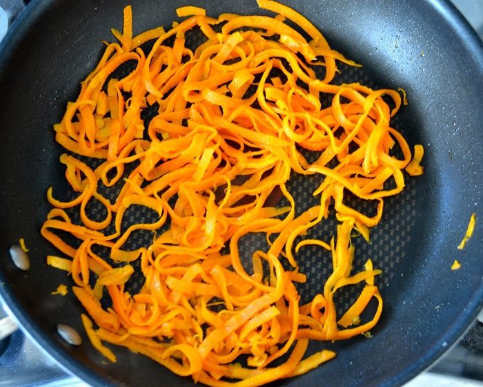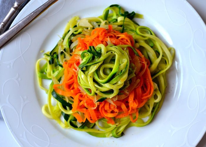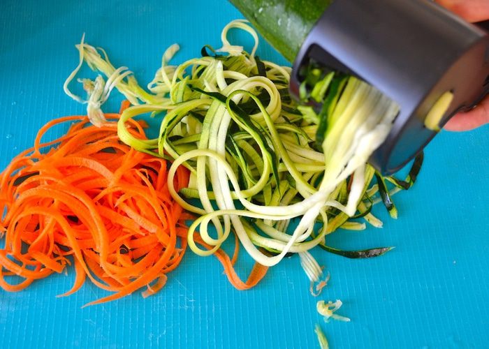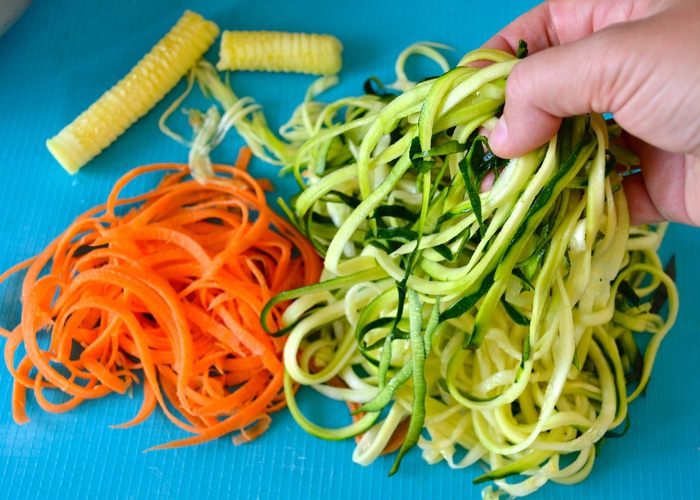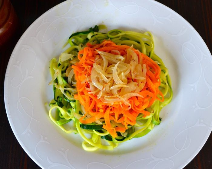 Подготовить первым делом овощи. Морковь очистить, вымыть, высушить и нарезать нитями (получается почти как нарезка жульен, только еще длиннее). Цукини также вымыть, но не снимать кожуру. Обрезать края и также натереть его нитями.