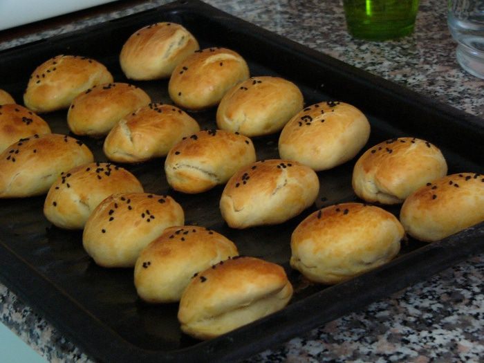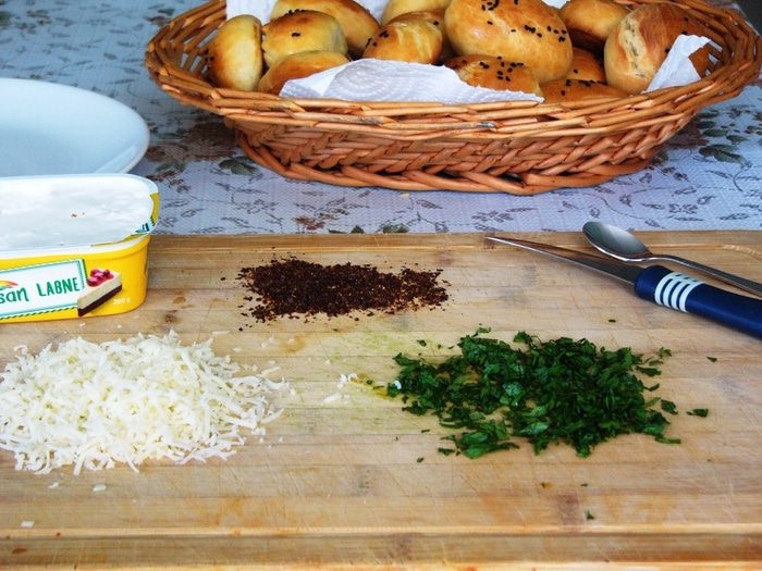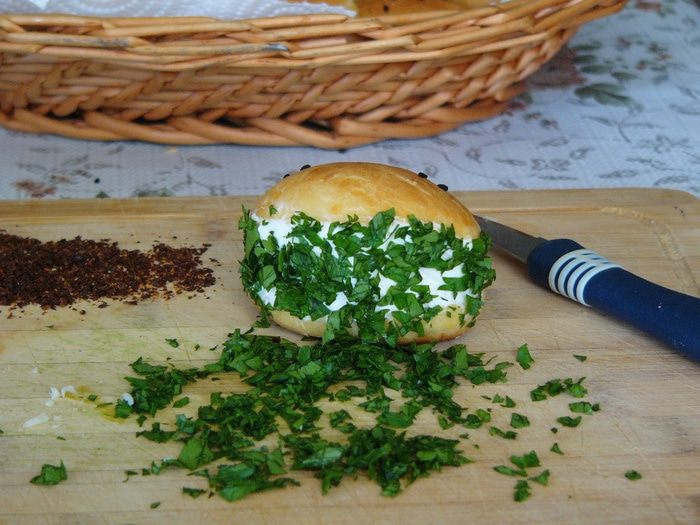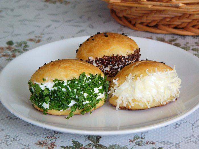 Пока пирожки остывают, готовим начинку. Здесь вы вольны проявить фантазию. Это может быть любимый плавленый или творожный мягкий сыр вашего ребенка, творог со сметаной, комбинация сыров, сыр с зеленью и чесноком для родителей :) Я использовала легкий творожный сыр для чизкейков лабне. Для украшения разреза мелко нарезать петрушку и/или укроп. Натереть на терке твердый сыр. У меня еще молотый красный перец (для папы). Опять же, вы можете и в этом пункте поступить по своему усмотрению и украсить пирожки чем-то другим.