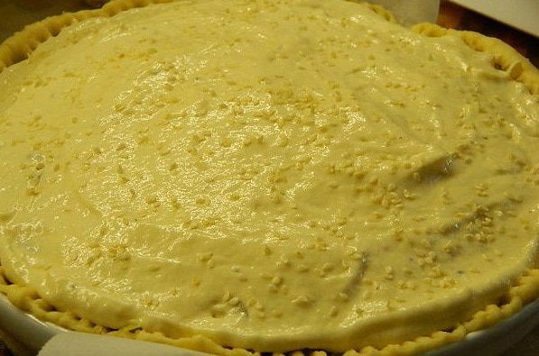 Залить тестом №2. Я посыпала кунжутом сверху, но это не обязательно!Выпекать при Т 200* 40-50 минут. Готовность проверить лучинкой. Когда вверх зарумянится, можно прикрыть фольгой, чтобы не сгорел! Я не накрывала. Все зависит от вашей духовки.
