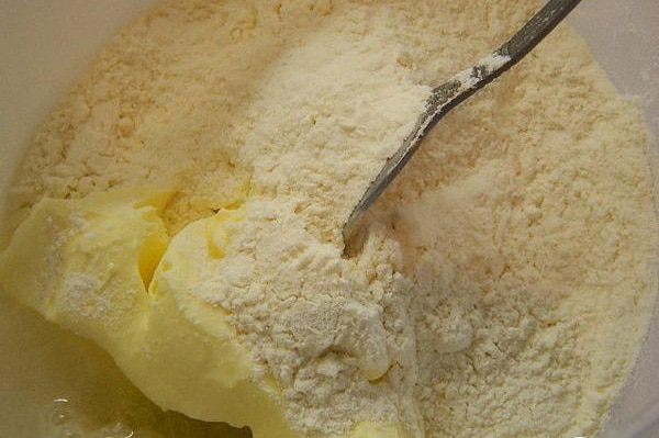 Готовим тесто №1: в миске смешать мягкое масло, яйцо, муку и воду, все перемешать.