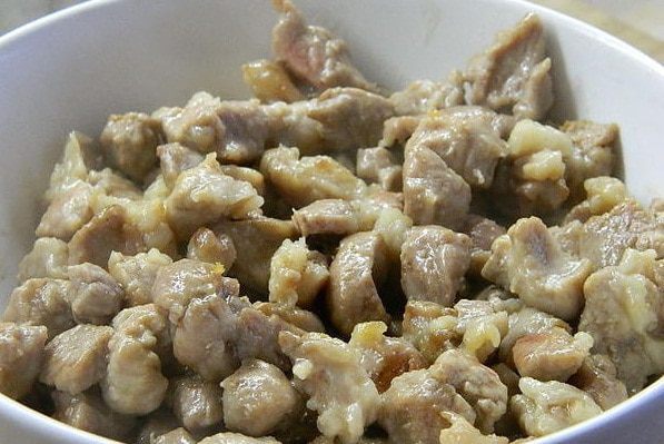 Тем временем готовим начинку: мясо порезать мелкими кубиками и обжарить на сковороде с добавлением растительного масла. Посолить и поперчить. Остудить