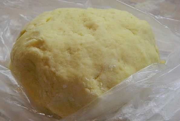 Добавить разрыхлитель и замесить мягкое, эластичное тесто. Убрать в пакет и в холодильник на 1 час.