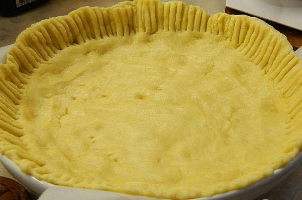 Форму для запекания смазать маслом. Выложить тесто №1 и разровнять руками, сделать бортики (диаметр моей формы 21 см).