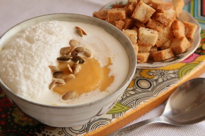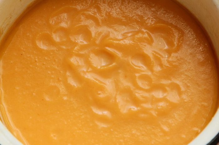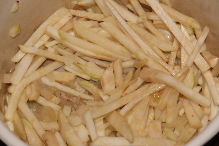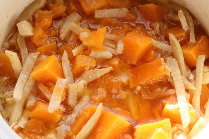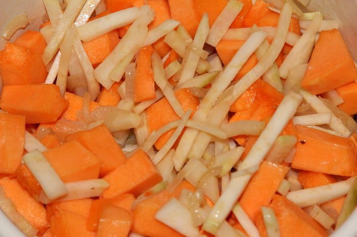 Я готовила все в кастрюльке. Тыкву почистить, порезать кубиком, сельдерей почистить, нарезать соломкой. В кастрюльке разогреваем масло и припускаем на нем до прозрачности порезанную полукольцами луковицу и рубленый чеснок. Затем добавляем сельдерей, перемешиваем и под крышкой тушим 5 минут.