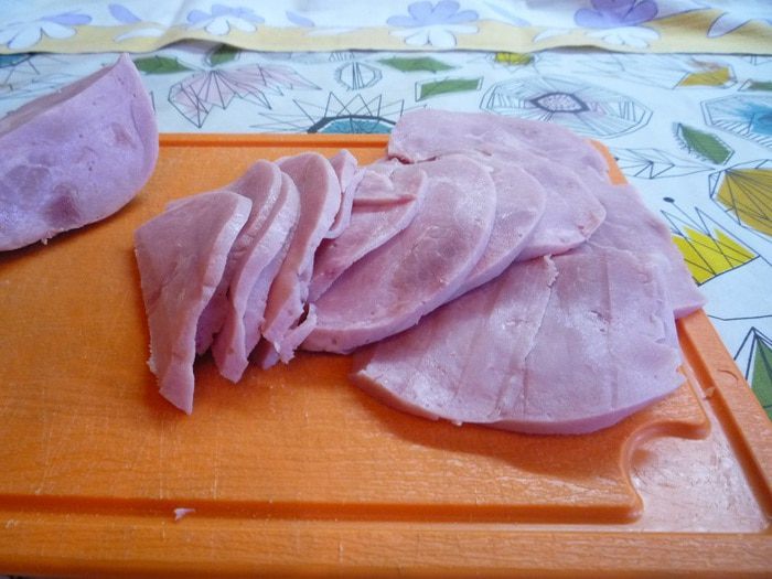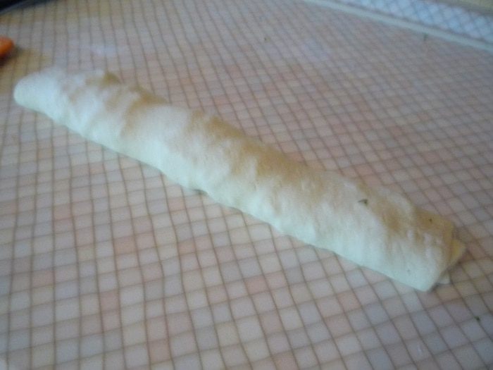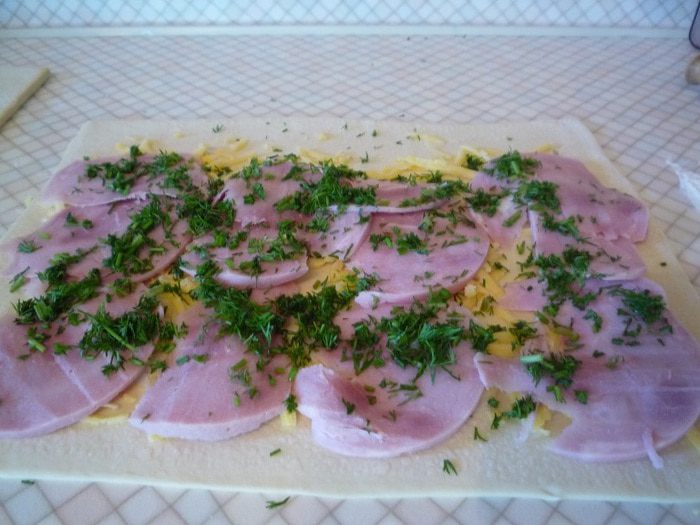 На прямоугольный пласт теста распределить сыр, поверх сыра уложить пластинки ветчины и щедро посыпать укропом.