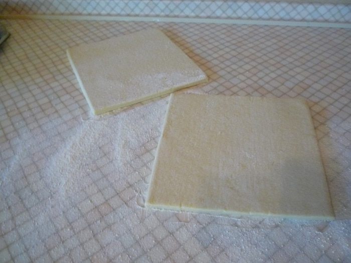Слоеное тесто разморозить, раскатать в прямоугольный пласт.