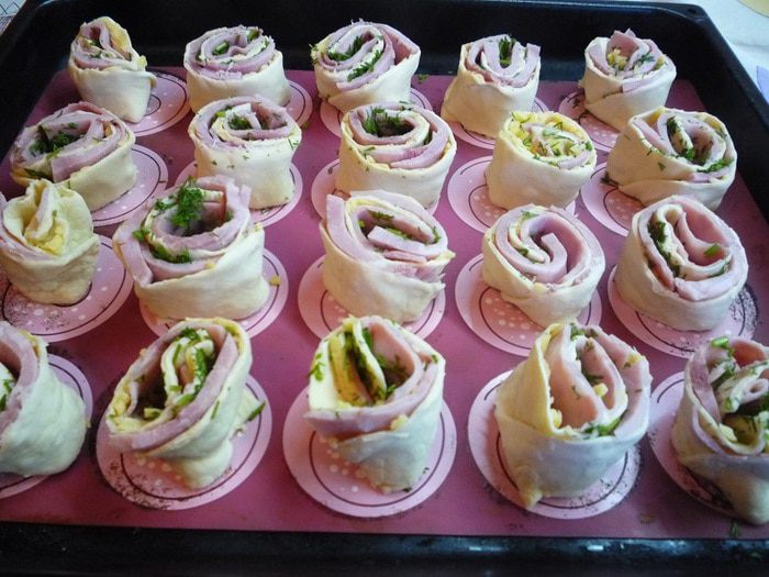 Аккуратно свернуть в рулет и нарезать на кусочки.