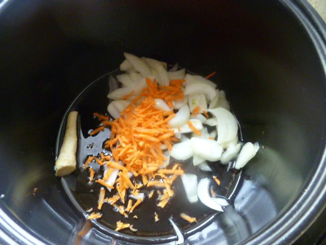 Затем я почистила овощи. Лук крупно нарезала, морковь натерла на терке, пастернак оставила целиком.