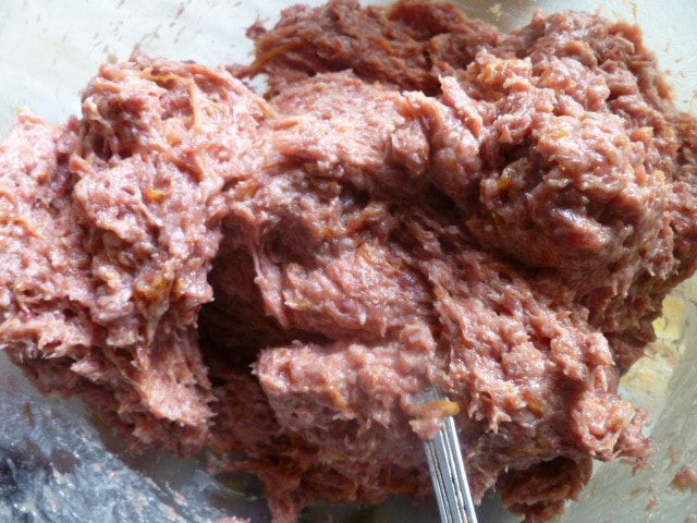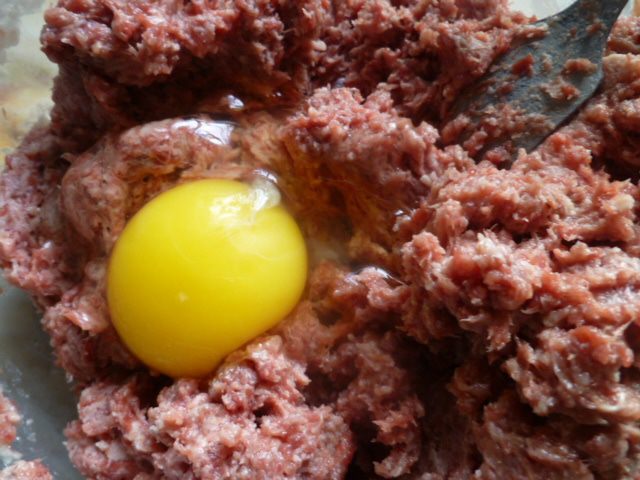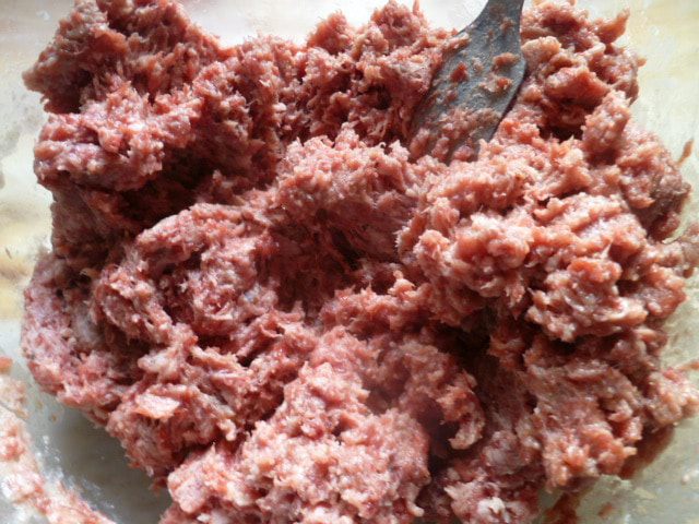 Для начала в фарш добавляем измельченный жир. У меня гусиный фарш, я добавила перекрученную на мясорубке гусиную шкуру, совсем немного.