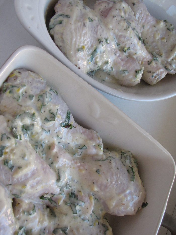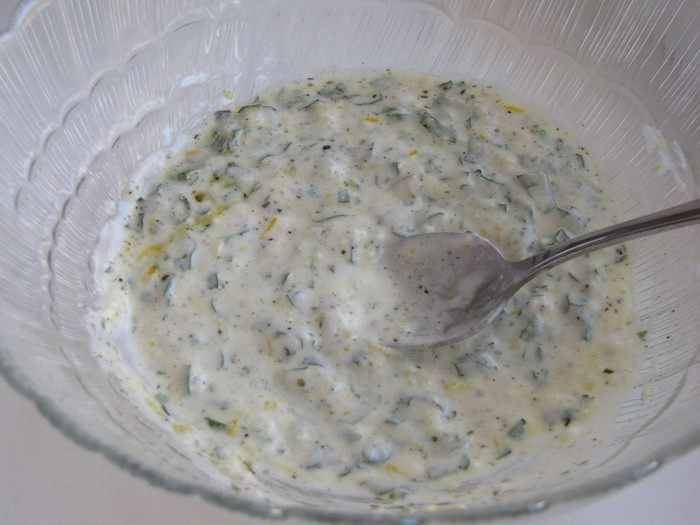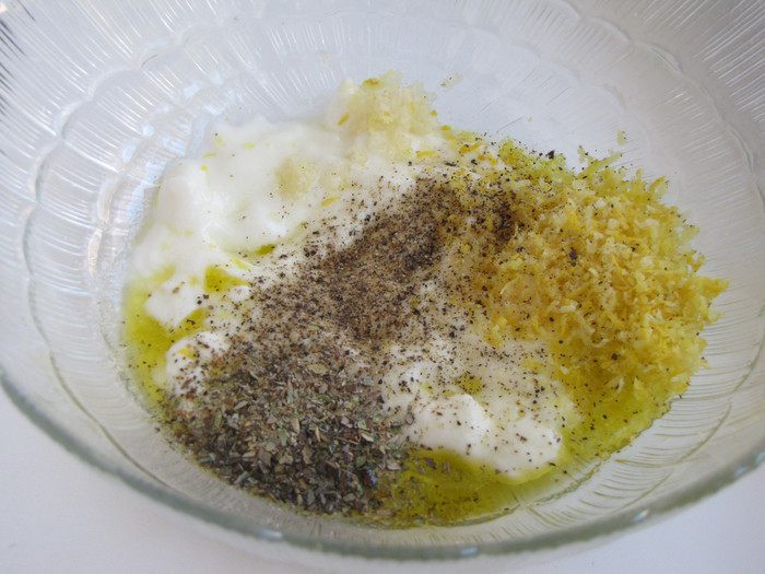 Приготовить маринад. Для этого смешать в емкости йогурт, оливковое масло, цедру лимона (натертую на мелкой терке), давленный чеснок, сухой орегано, соль и перец. Выдавить сок половины лимона.