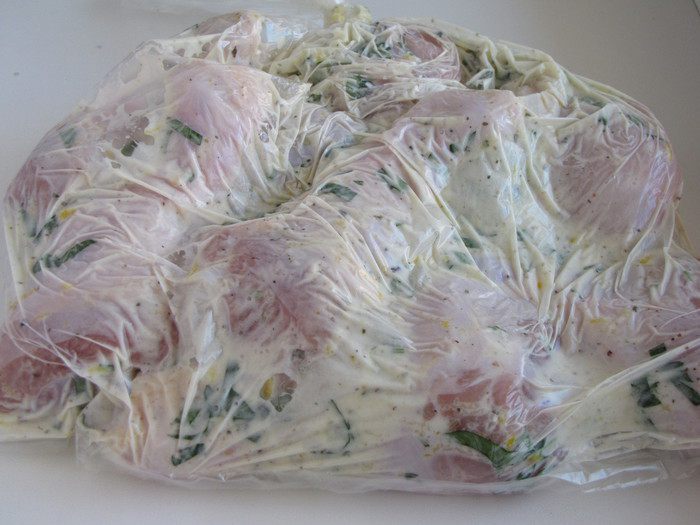Поместить курицу вместе с маринадом в полиэтиленовый пакет, завязать пакет, не оставляя в нем воздуха. Помассировать пакет, чтобы хорошо перемешать маринад и мясо. Оставить пакет с курицей минимум на 1 час.