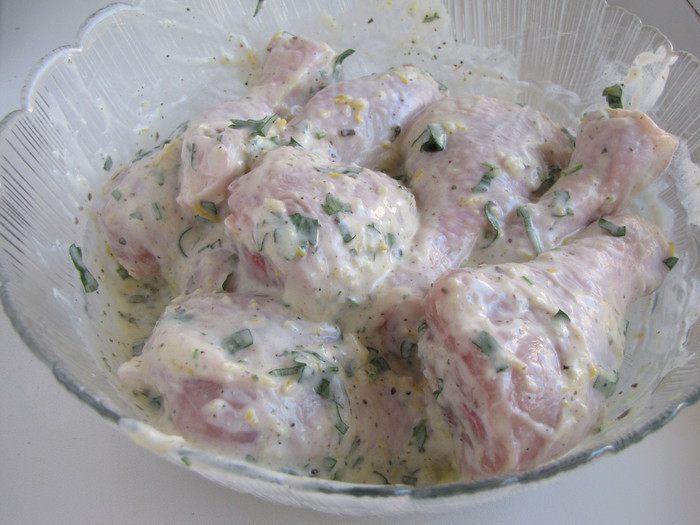 Подойдут любые части курицы (крылья, бедра, голени). Маринад расчитан на 2 кг. курицы, но можно сделать меньше. Я приготовила половину маринада для восьми голеней.