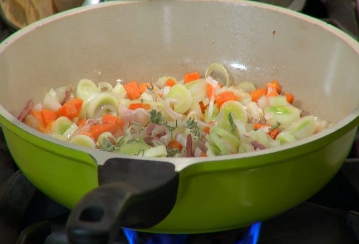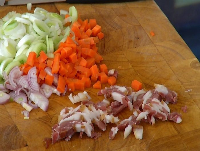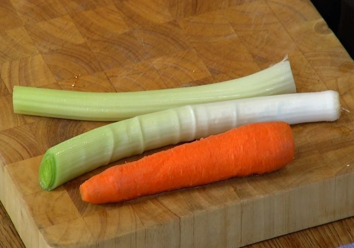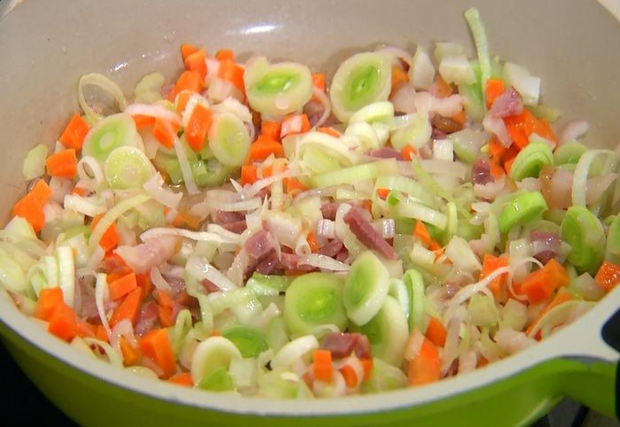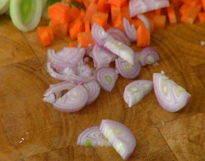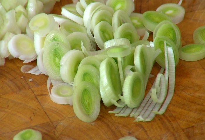 Светлую часть лука-порея нарезать кольцами.