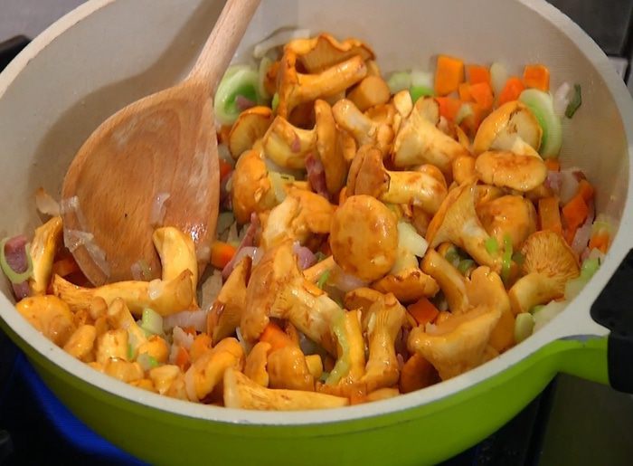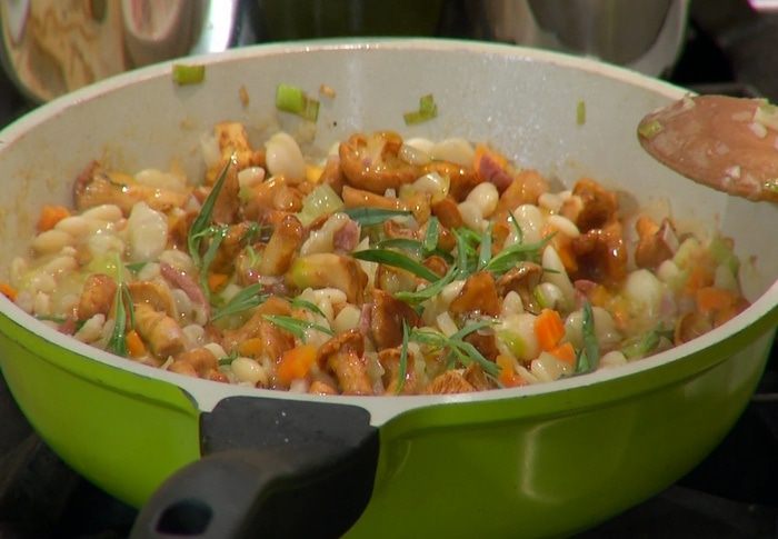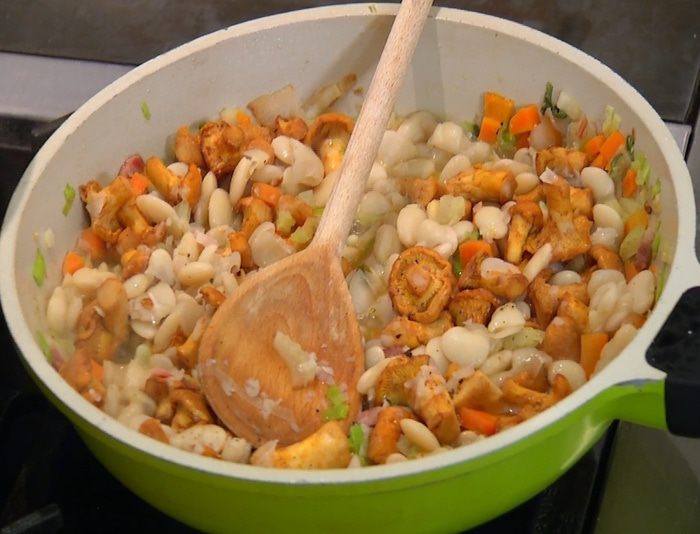 Фасоль после варки хорошо оставить в той жидкости, в которой она варилась, и слить только тогда, когда все остынет. Грибы долго готовить не нужно, особенно такие нежные, как лисички, иначе они теряют свою звонкость.