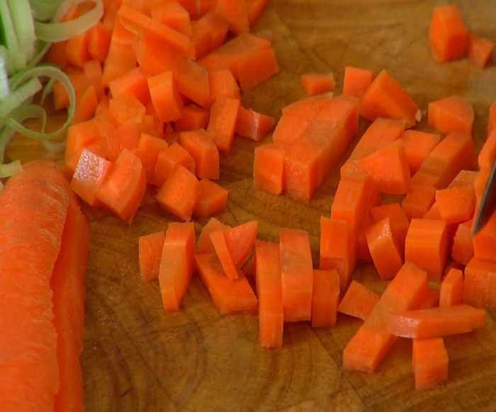 Стебель сельдерея и морковь порезать маленькими кубиками.