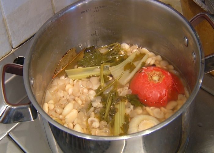 Фасоль замочить на ночь в воде, утром залить свежей водой, добавить помидор, стебель сельдерея с зеленью, очищенный лук и чеснок, лавровый лист и отварить до готовности, затем остудить и слить жидкость.