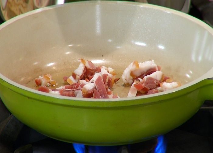 Разогреть в сковороде оливковое масло и обжаривать сало пару минут.