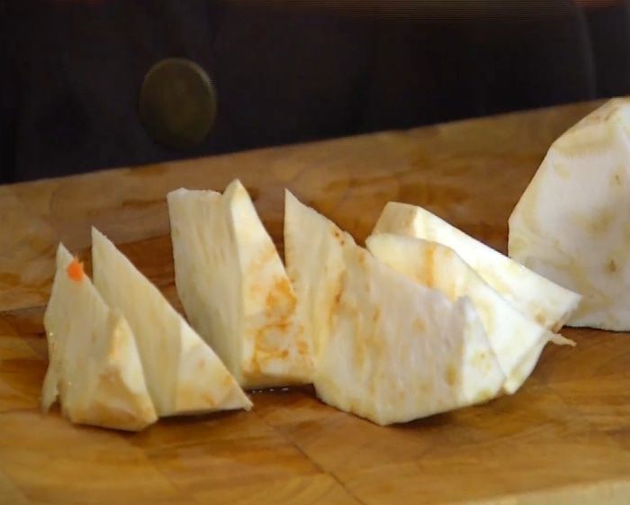 Корень сельдерея и топинамбур почистить и нарезать крупными кусками.
