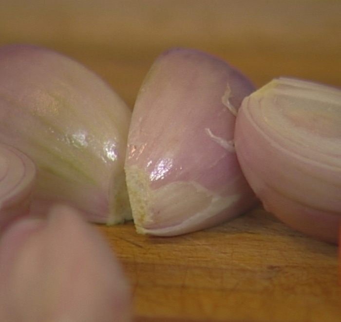 Лук-шалот почистить и разрезать пополам.