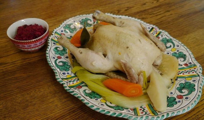 Готового цыпленка подавать с овощами, с которыми он варился, и свекольным соусом.