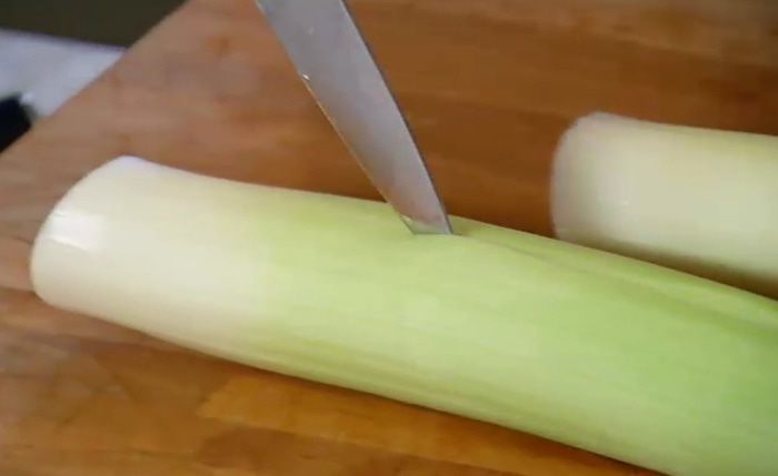 Лук-порей разрезать вдоль, не прорезая до конца.