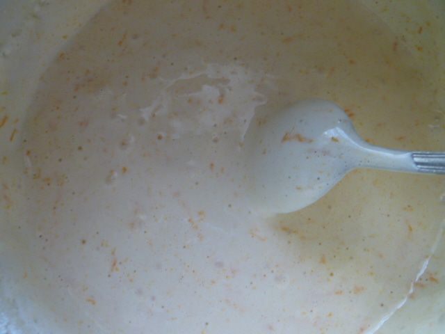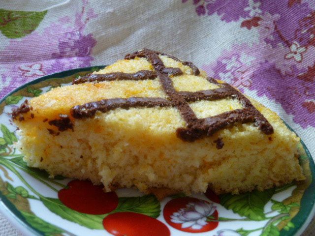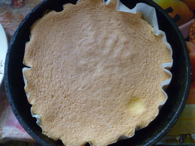 Бисквит сам по себе нежный, но я все же пропитала его облепиховым сиропом (взяла облепиховое варенье и немного воды).