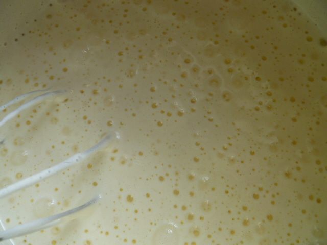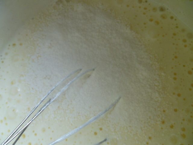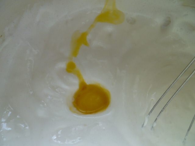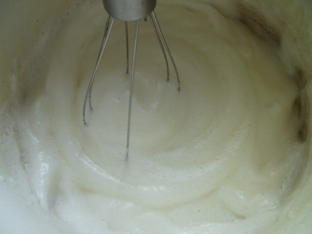 Затем понемногу добавляем сахар продолжая взбивать до крепкого безе.