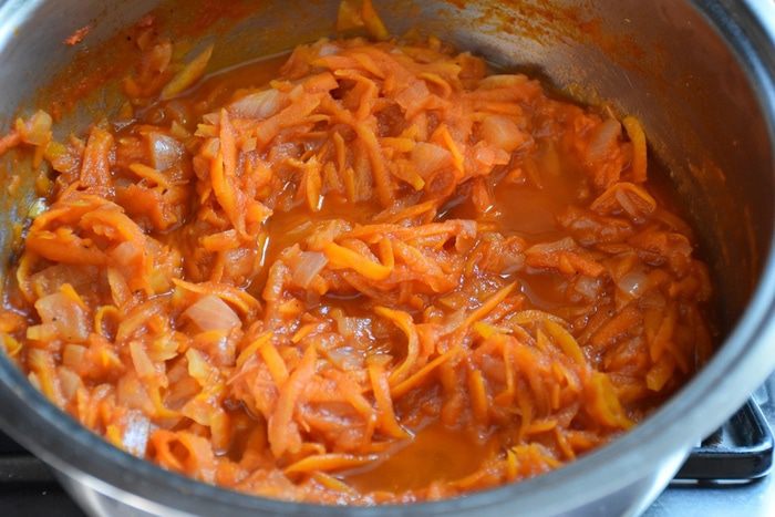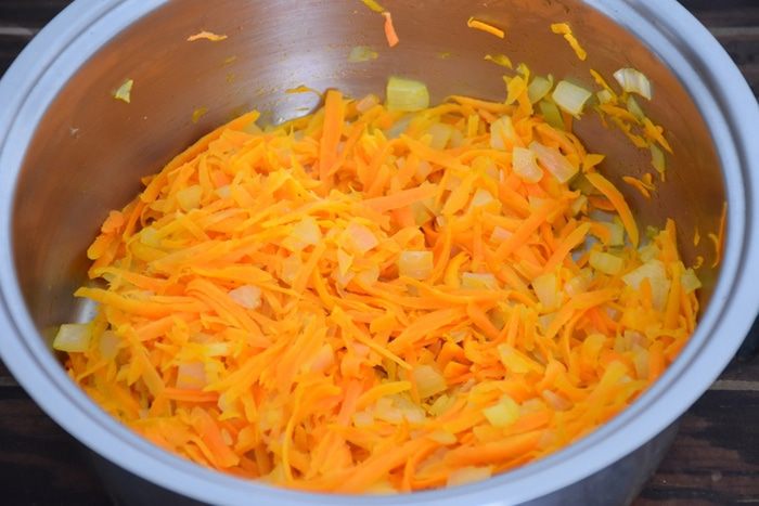 Лук и морковь натереть на крупной тёрке, положить в сотейник и обжарить в 3 ст.л. растительного масла 10-15 минут.