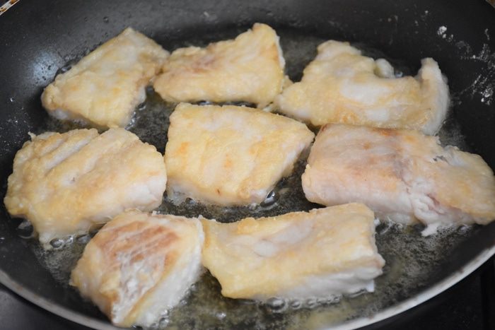 Рыбное филе обсушить и нарезать небольшими кусочками. Посолить и поперчить по вкусу.