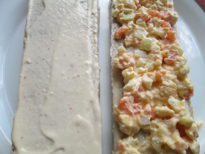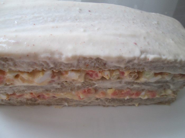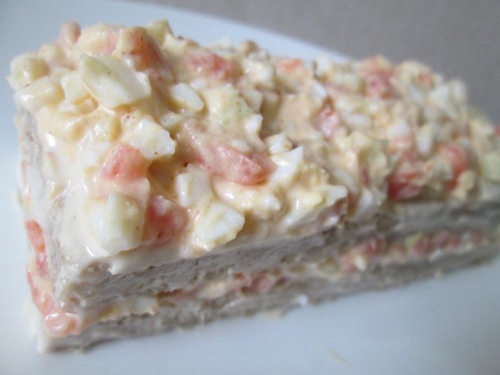 Подготовим все ингредиенты: хлеб освободим от корочки и нарежем на 3 прямоугольника, отварим яйца и измельчим их. Огурцы нарежем тонкими пластинами и слегка присолим, чтобы они стали мягкими и легко складывались для украшения.