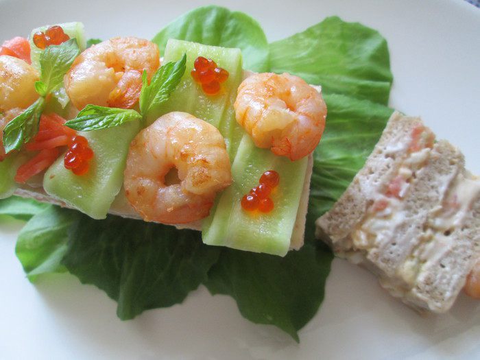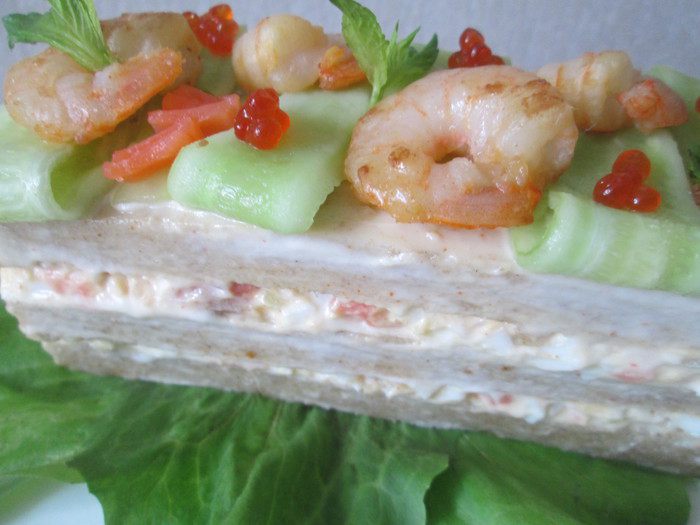 Рыба из семейства лососевых подойдет любая! Вместе с креветками, вкусным соусом, которым пропитывается сэндвич, создается приятная вкусовая гамма.