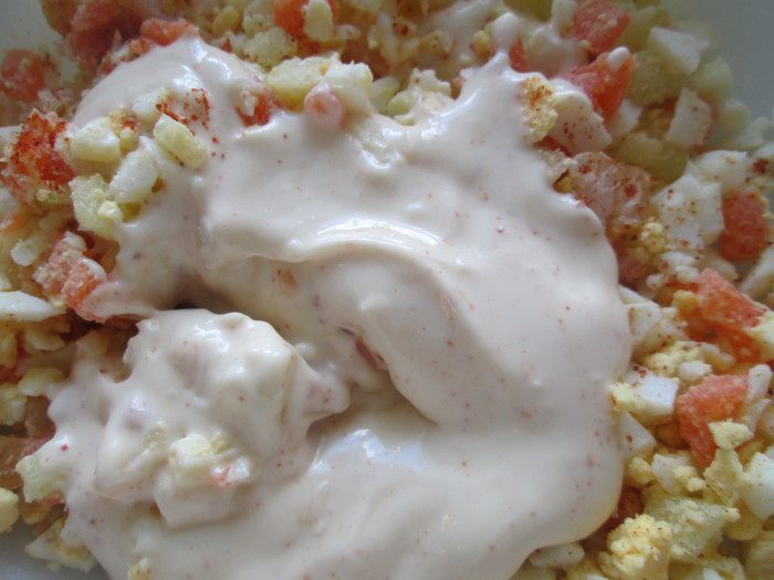 Измельчаем болгарский перец, добавляем мелкие креветки, яйца и заправляем 1/2 частью охладившегося соуса.