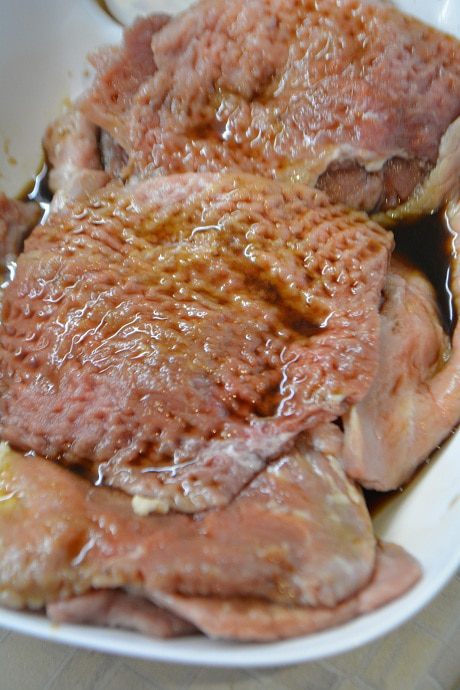 Замариновать мясо в смеси соевого соуса и смеси 5 перцев на 2 часа.