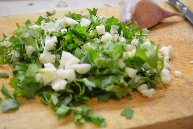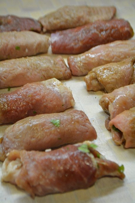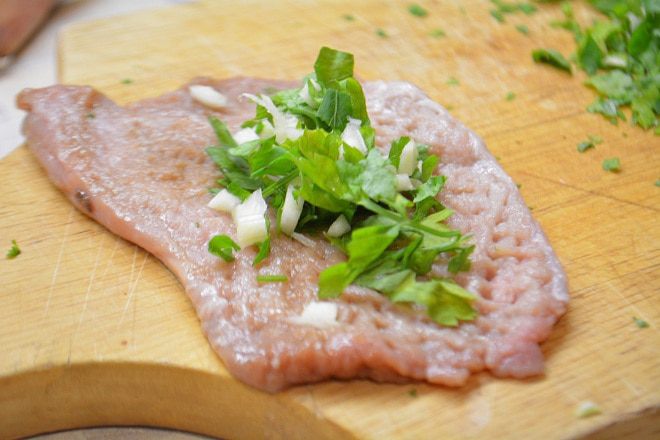 Заворачиваем рулетиком. При необходимости скрепить зубочисткой или кулинарной нитью. Я ничем не скрепляла. Пусть полежит минут 10-15, чтобы мясо напиталось вкусом и ароматом зелени и чеснока.