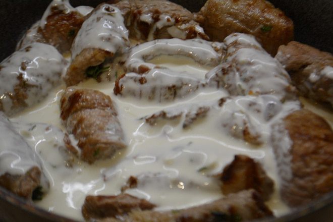 Сложить в жаровню и залить сметаной, разведенной с мукой. Накрыть крышкой и тушить на медленном огне 30 минут.