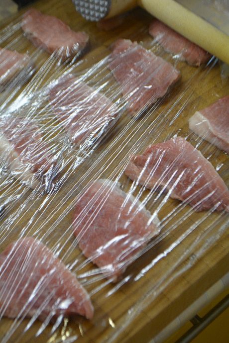 Мясо помыть, обсушить и нарезать на порционные куски. Выложить на разделочную доску, накрыть пищевой пленкой и хорошо отбить.