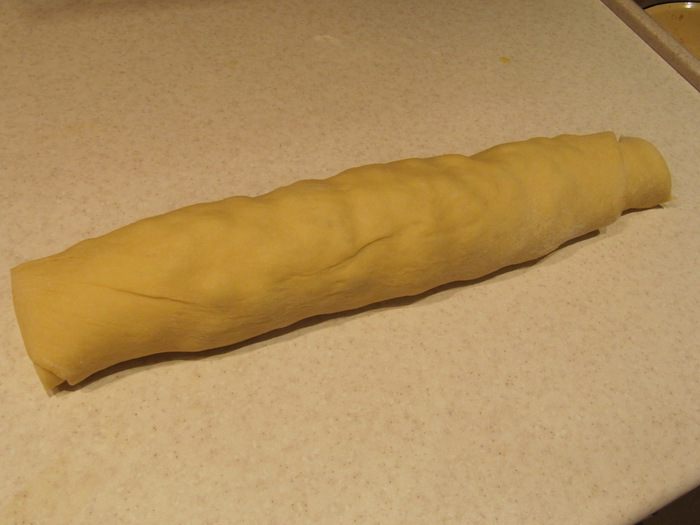 Добавить в опару слегка взбитые вилкой яйца и растопленное сливочное масло (масло должно быть теплым, не горячим!). Затем добавьте оставшуюся просеянную муку и щепотку соли. Вымесить тесто на слегка припыленной мукой поверхности около 7-10 минут.