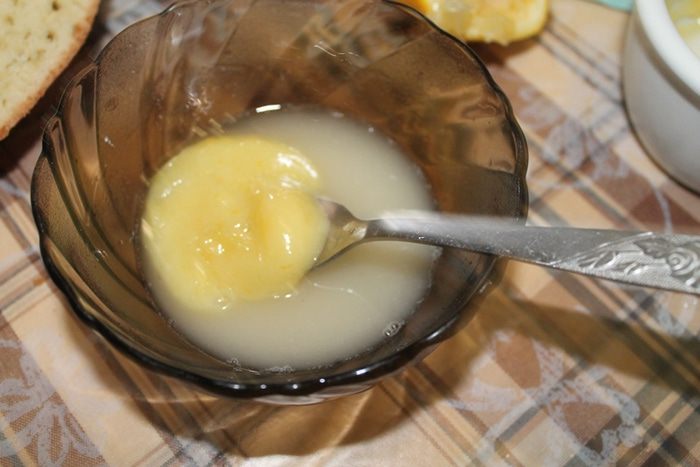Для этого выжимаем сок половины лимона и смешиваем его со столовой ложкой сахарной пудры (столовая ложка с горкой). По желанию (у меня всегда есть такое желание) можно добавить столовую ложку лимонного курда.