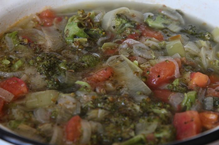 Лук-порей нарезать полукольцами, брокколи разобрать на соцветия, крупные разрезать. На сковороде разогреть растительное масло и протушить 15 минут лук с брокколи. Воду наливаем в кастрюлю и ставим на огонь. Как только вода закипит - отправляем туда овощи. Готовим минут 5. Помидор очищаем от кожицы, нарезаем кубиком и добавляем к овощам. Готовим 5 минут. Добавляем майоран и выключаем огонь. Даем супу немного "отдохнуть".