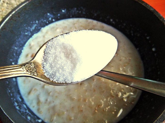 Нагреваем молоко и всыпаем хлопья (ложки без горки). Добавляем сахар по вкусу, соль. Варим пару минут, выключаем и немного настаиваем под крышкой. Открываем крышку, кидаем кусочек сливочного масла, перемешиваем.