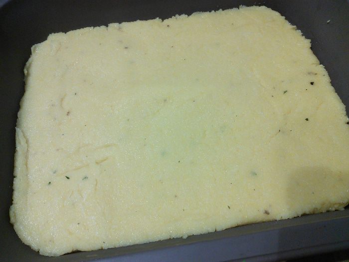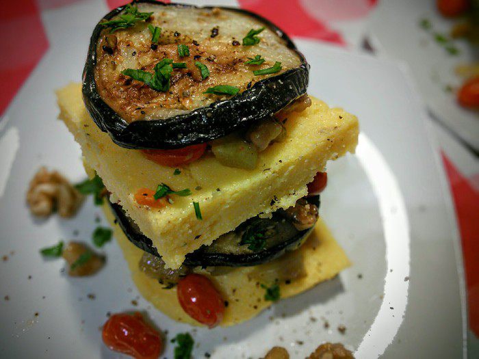 Теперь остаётся собрать башенки: поленту порезать на квадратики и выложить слоями, чередуя кружочки баклажанов, ломтики поленты и томлёные овощи.