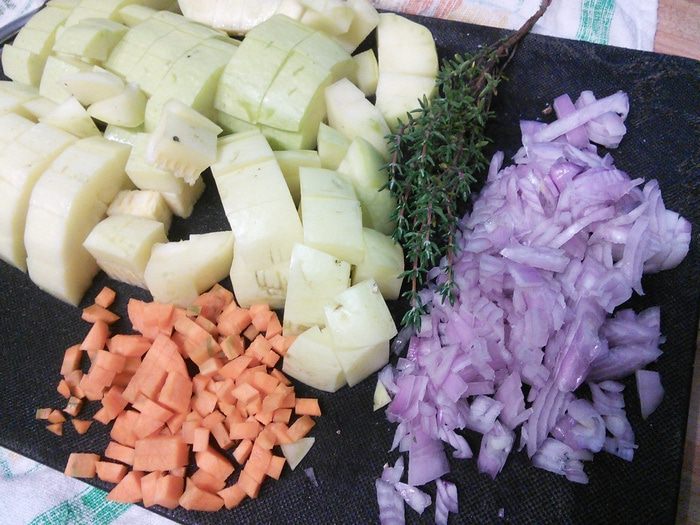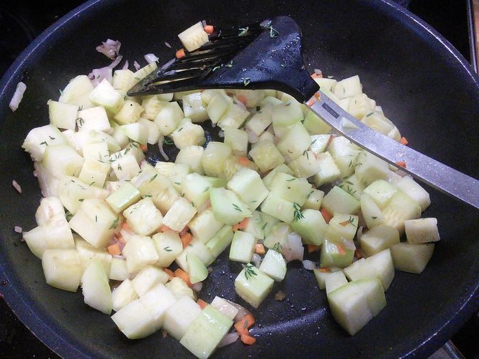 Шалот, морковь и кабачок нарежем кубиком (кабачок более крупным кубиком), разогреем оливковое масло на сковороде.