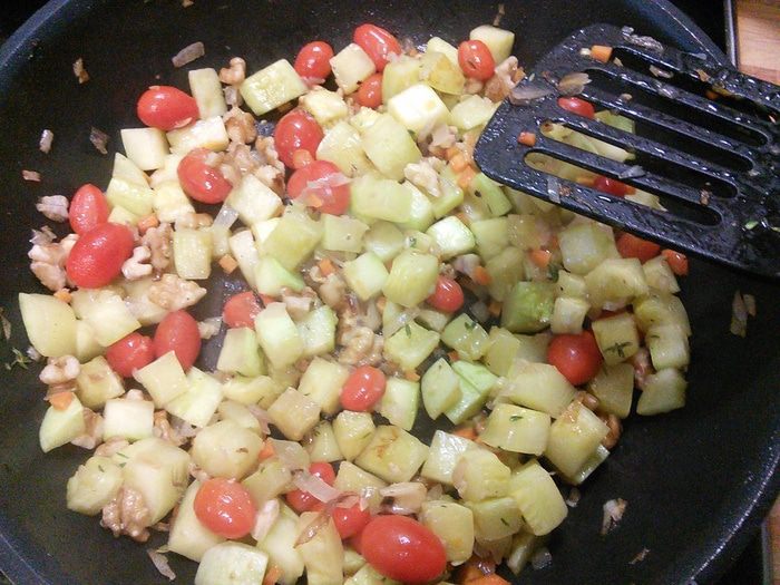 Обжарим овощи, добавим орехи, тимьян, посолим и поперчим по вкусу. Овощи не пережарьте, должна остаться "хрустинка".