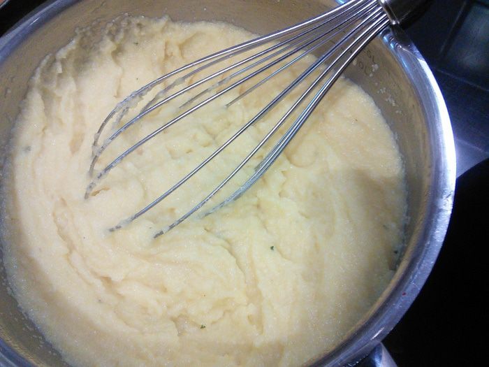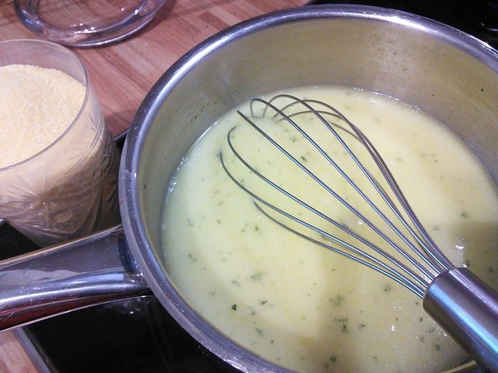 Потихоньку всыпем поленту, при постоянном помешивании доведём до кипения и поварим её минутки три.