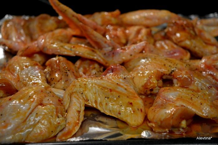 Готовим на гриле или в духовке. Кисточкой смазать все крылышки и выложить на разогретый гриль, прикрыть крылышки фольгой сверху или готовить в духовке 200 гр. Перед окончанием готовки за 5 мин вновь смазать соусом и поставить в духовку или гриль.