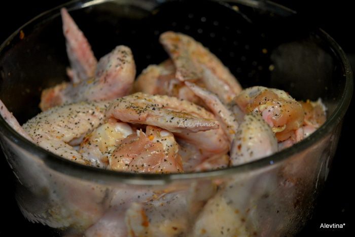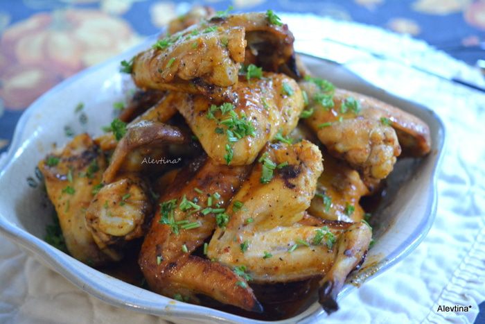 Готовые крылышки подаем к столу, украсив зеленью свежей. Приятного аппетита. Я использовала соус как в оригинале, для нас было не слишком пряно, мед гасит остроту частично.