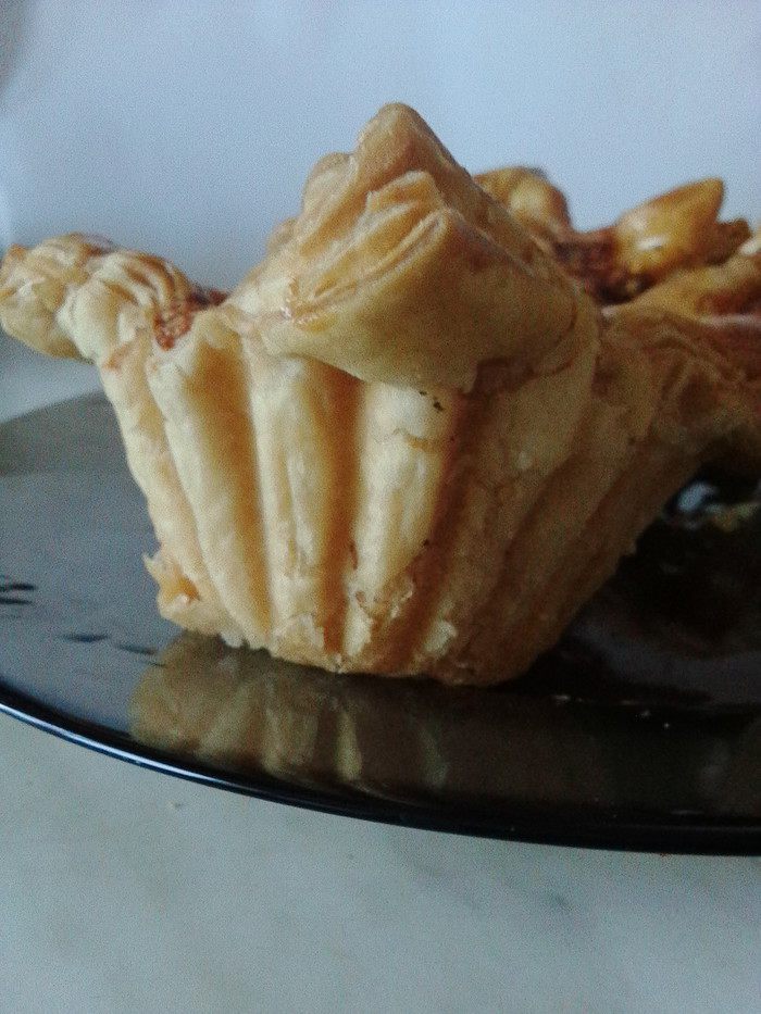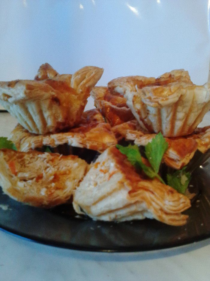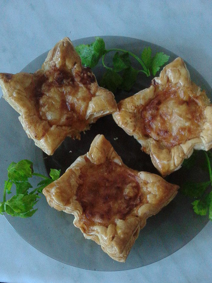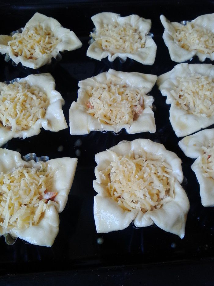 Начинку выложить на каждый квадрат теста, посыпать оставшимся сыром, уголки теста смазать яйцом. Выпекать в духовке 20-30 минут (следите по своей духовке).