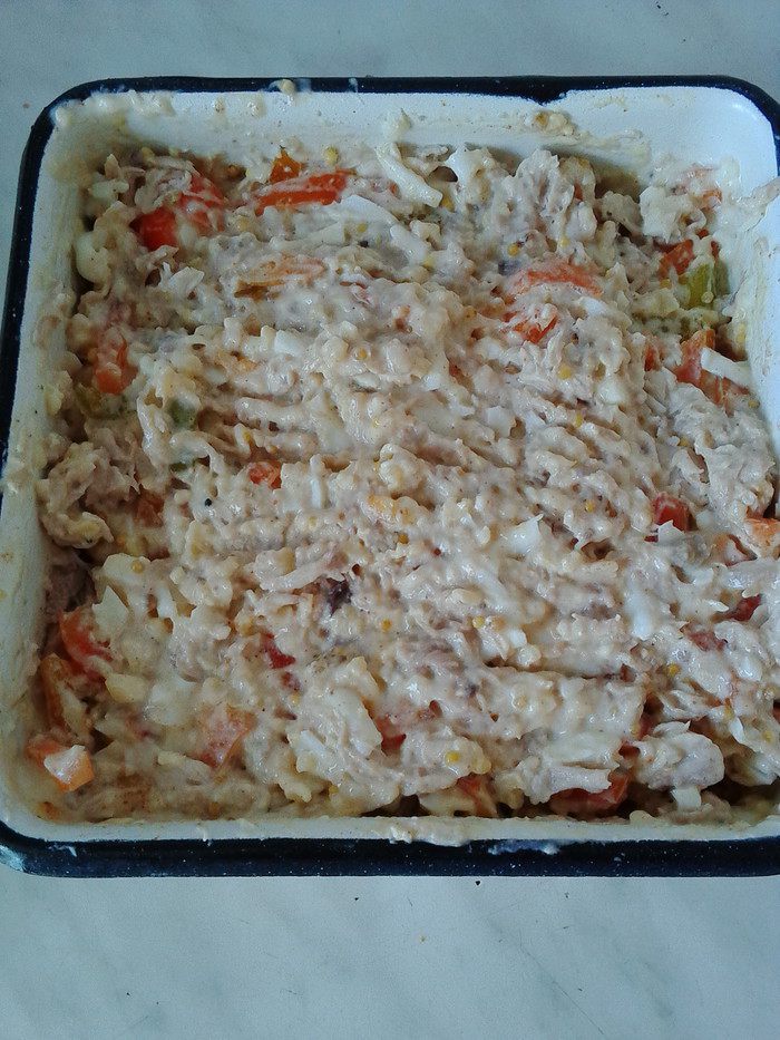 Для начинки подойдёт любое отварное мясо (у меня куриное), его мелко порубить, смешать с горчицей, сметаной, половиной сыра, болгарским перцем, отварные яйца натереть на терке. Всё смешать, соль и перец по вкусу.