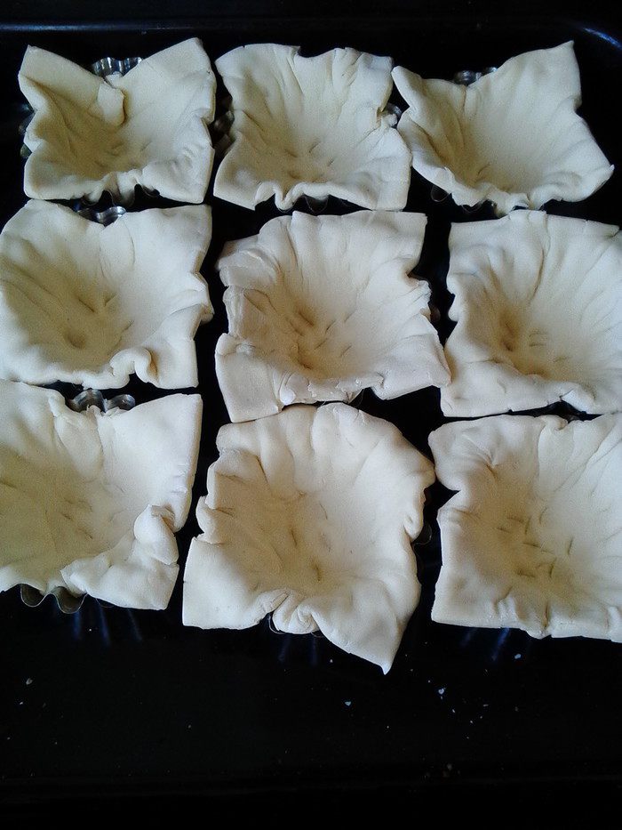 Тесто (у меня покупное размороженное) нарезать на квадраты и поместить в формы для кексов. Включить духовку на 200°, сыр натереть на терке, перец болгарский нарезать небольшими кусочками, отварить 2 яйца.
