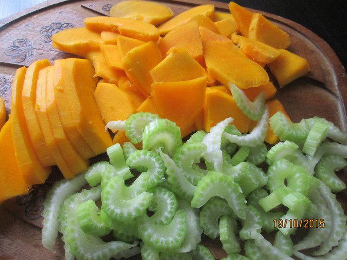 Тем временем нарезаем сельдерей и тыкву ломтиками. Добавим к ним листики шалфея (у меня тимьян), оливковое масло, соль, перец.